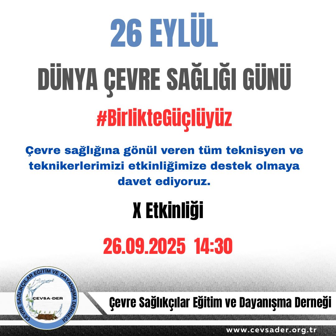 Bilindiği üzere Derneğimizin alt yapısını oluşturan Çevre Sağlıkçılar Platformunun teklifi ile 2022 yılı itibariyle Türkiye’de 26 Eylül tarihi Dünya Çevre Sağlığı günü olarak kutlanmaya başlanmıştır. Tüm Çevre Sağlığı Teknisyen ve Tekniker Meslektaşlarımızın günlerini Dernek Yönetimi olarak kutlarız.
