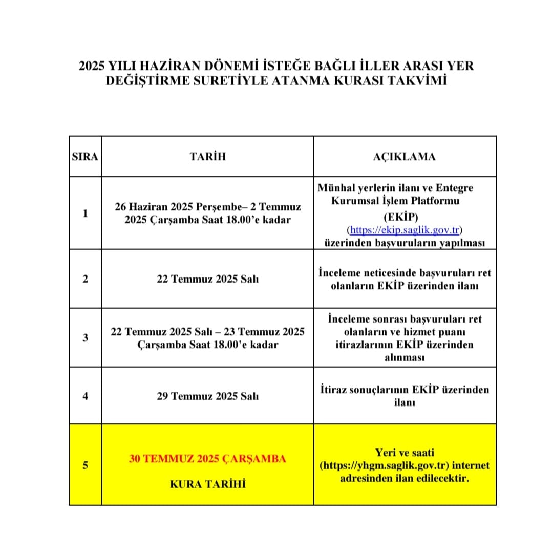 İlan Metni ve Münhal Kadrolar Yayımlanmıştır. Tercih Başvuruları 02.07.2025 Tarihi saat 18:00'e kadar https://ekip.saglik.gov.tr adresinden erişim sağlanan Entegre Kurumsal İşlem Platformu (EKİP) üzerinden yapılmaktadır.