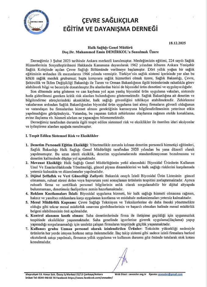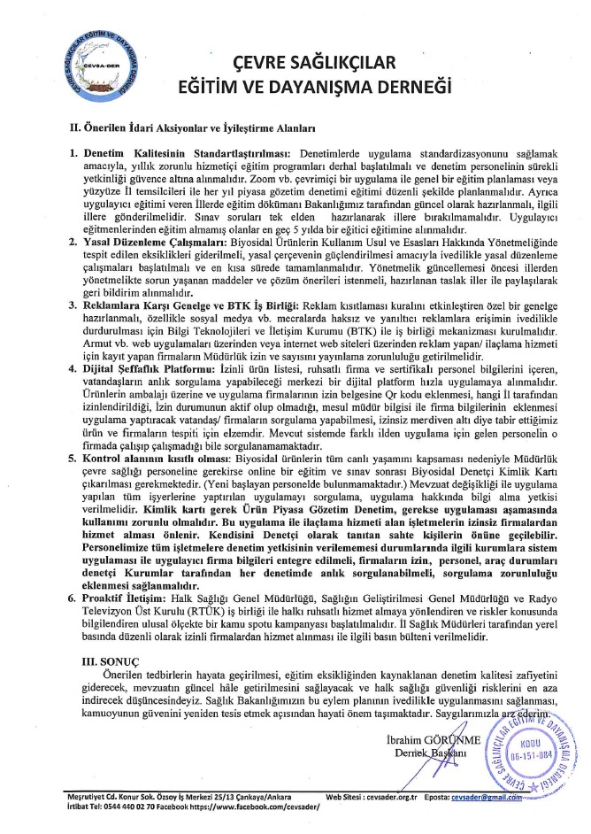 Hazırlanan raporda; biyosidal ürünlerin yanlış ve mevzuata aykırı kullanımı sonucu ortaya çıkan halk sağlığı risklerine dikkat çekilirken, denetim mekanizmalarının güçlendirilmesi, uygulayıcı eğitimlerinin standart hale getirilmesi, yetkilendirme süreçlerinin etkinleştirilmesi ve mevcut mevzuatın güncel ihtiyaçlar doğrultusunda revize edilmesine yönelik somut çözüm önerilerine yer verildi.
