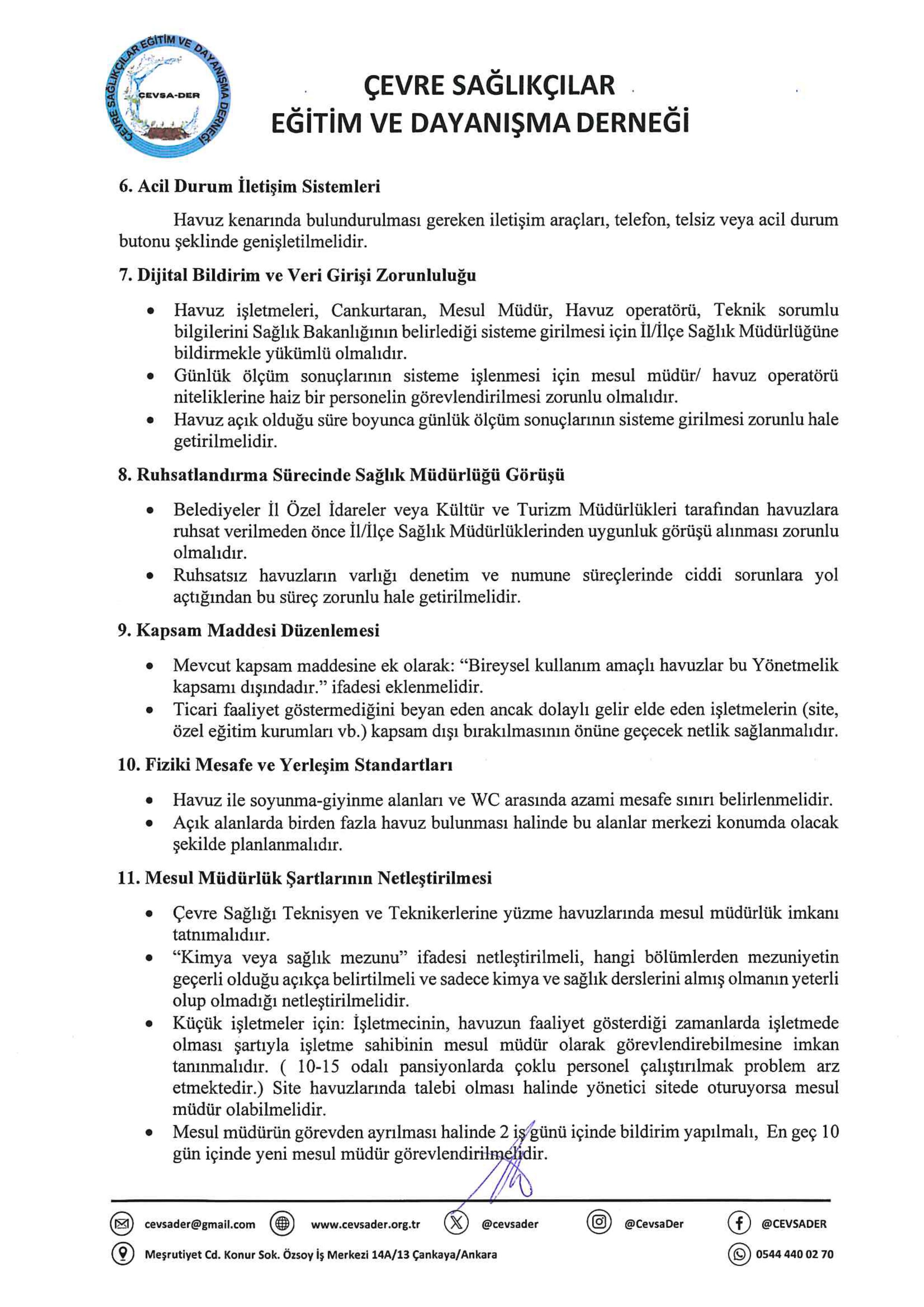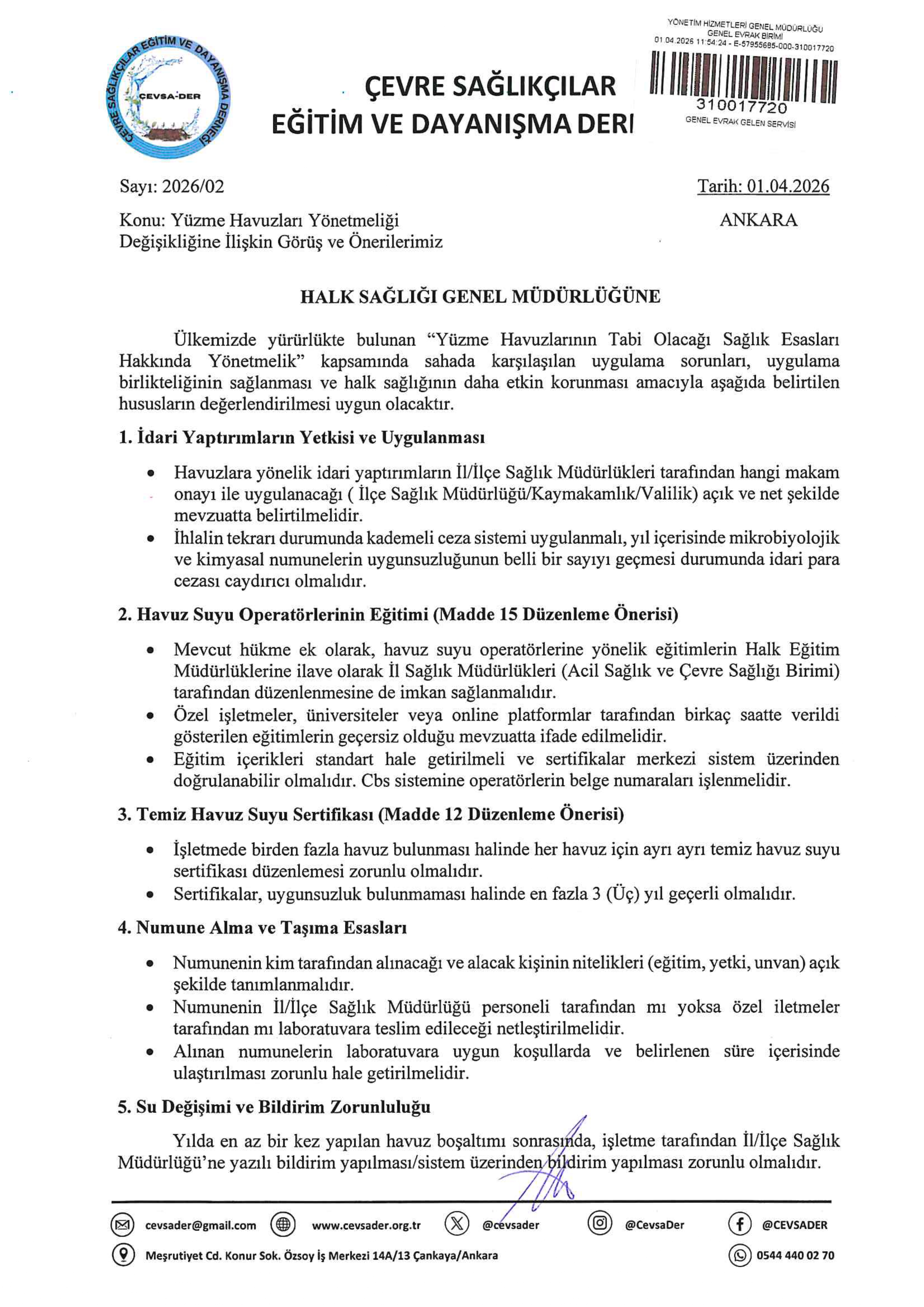 Çevre Sağlığı alanında faaliyet gösteren derneğimiz tarafından, “Yüzme Havuzlarının Tabi Olacağı Sağlık Esasları Hakkında Yönetmelik” kapsamında hazırlanan görüş ve önerilerimize ilişkin resmi yazı, Dijital Yazışma Sistemi (DYS) üzerinden Halk Sağlığı Genel Müdürlüğü Çevre Sağlığı Daire Başkanlığı’na iletilmiştir.