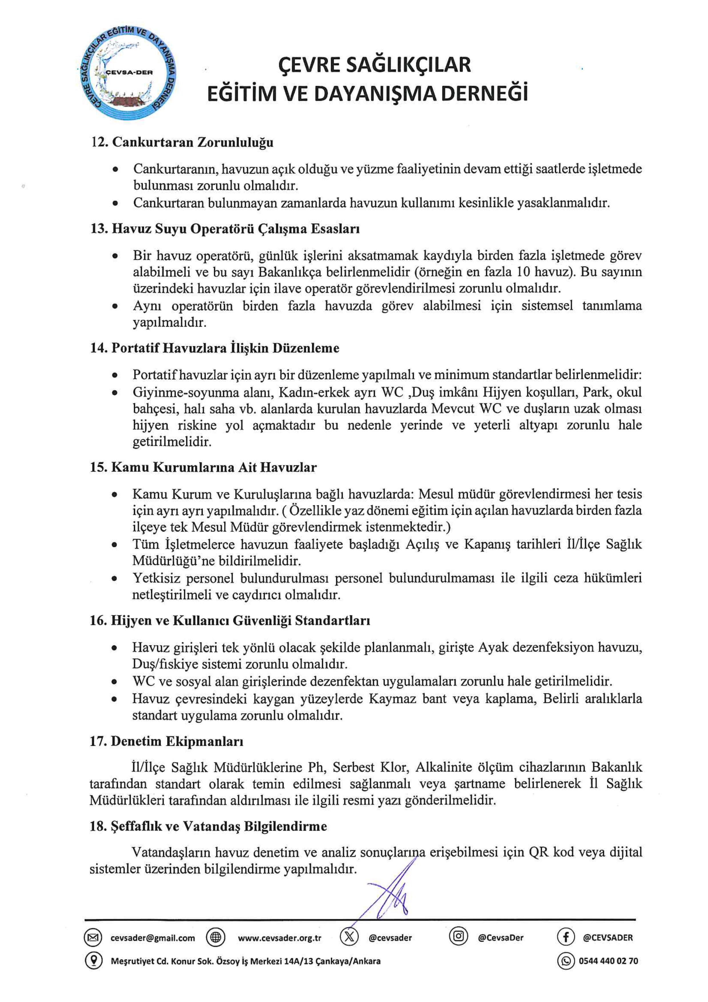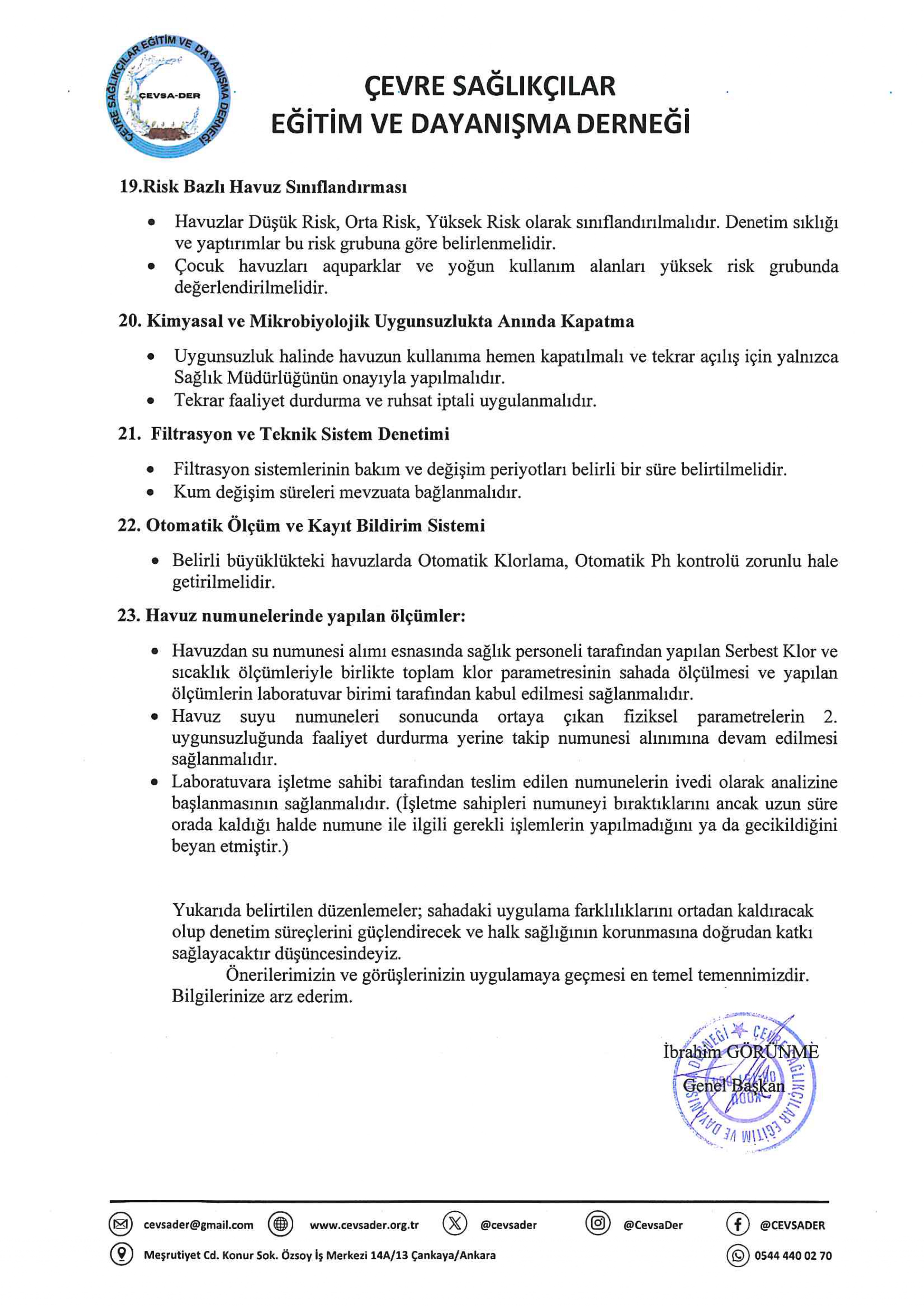 Söz konusu çalışma, sahada bilfiil sözkonusu yönetmelik ile çevre sağlığı teknisyen ve tekniker meslektaşlarımız tarafından aşağıdaki 23 başlık üzerinden yüzme havuzlarında halk sağlığının korunması, hijyen standartlarının geliştirilmesi ve uygulamada karşılaşılan sorunların giderilmesi amacıyla saha deneyimleri ışığında hazırlanmıştır. Hazırlanan öneriler